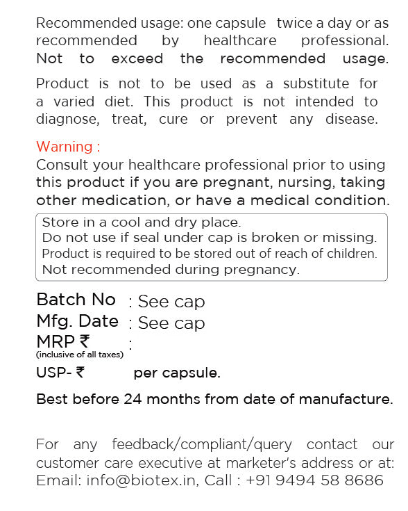 All Nutraceuticals, Dietary and Health Supplements of BIOTEX are approved by the Food Safety and Standards Authority of India (FSSAI)/ department of AYUSH and formulated based on clinically validated research.