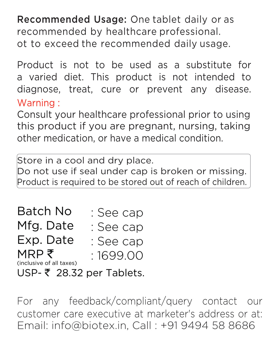 All Nutraceuticals, Dietary and Health Supplements of BIOTEX are approved by the Food Safety and Standards Authority of India (FSSAI)/ department of AYUSH and formulated based on clinically validated research.