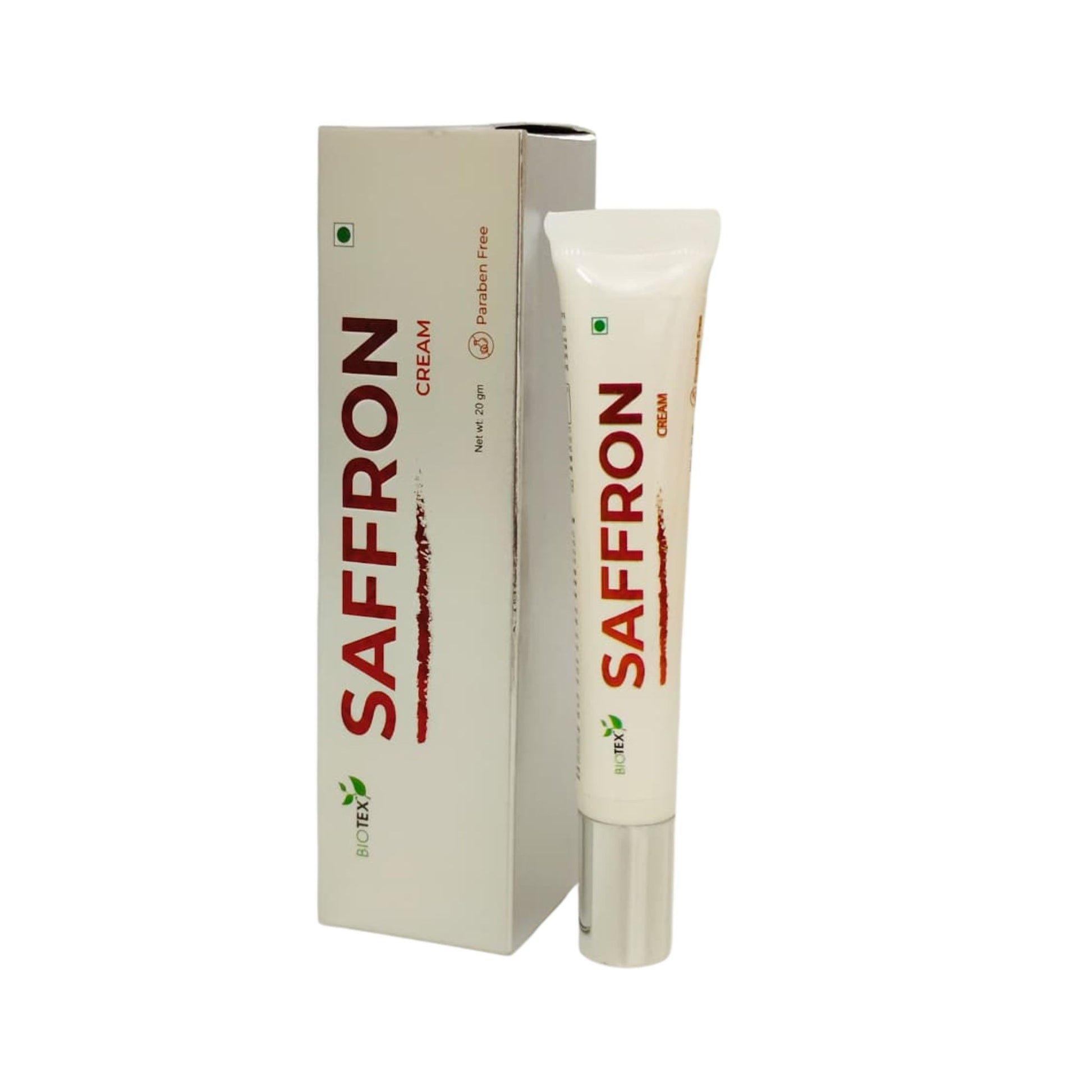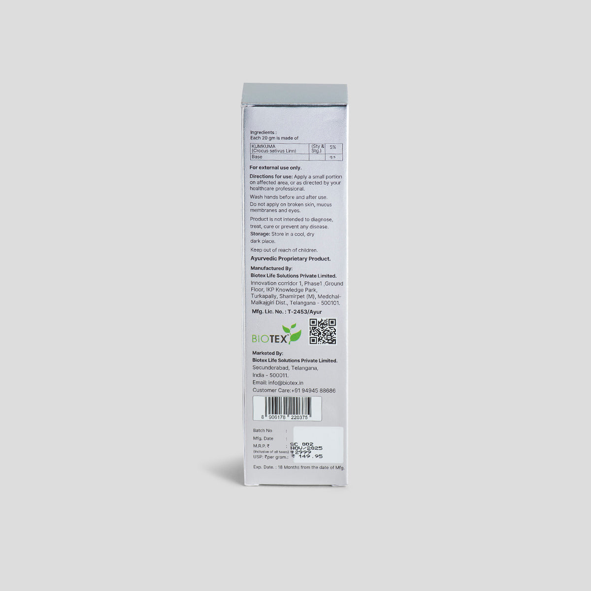 The BIOTEX Saffron (Kumkuma) Cream is your key to achieving a naturally radiant and luminous complexion. This specialized 20 gm tube holds a potent Ayurvedic Proprietary Product formulated with a high concentration of Kumkuma (Crocus Sativus Linn) [5% Sty & Stg], the most sought-after ingredient for skin brightening. Why is Kumkuma (Saffron) the Best Choice for Your Skin? Saffron is celebrated in Ayurveda for its exceptional ability to lighten the appearance of skin tone and impart a flawless, golden glow. Our cream works to nourish the skin, minimize the look of uneven patches, and revive tired, dull skin, transforming it into a radiant canvas. Clean & Trustworthy Formulation: We prioritize your skin's health. This formulation is strictly Paraben-Free, ensuring you are applying only gentle and beneficial ingredients.
