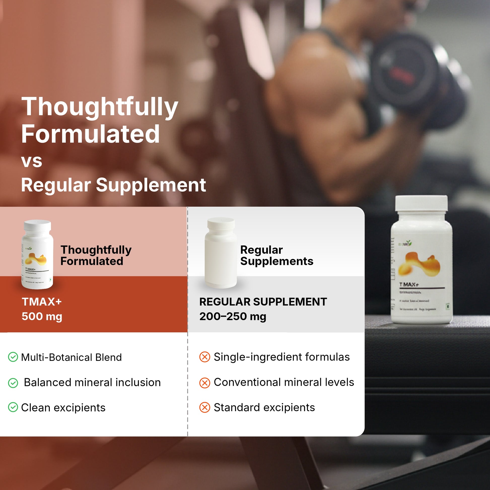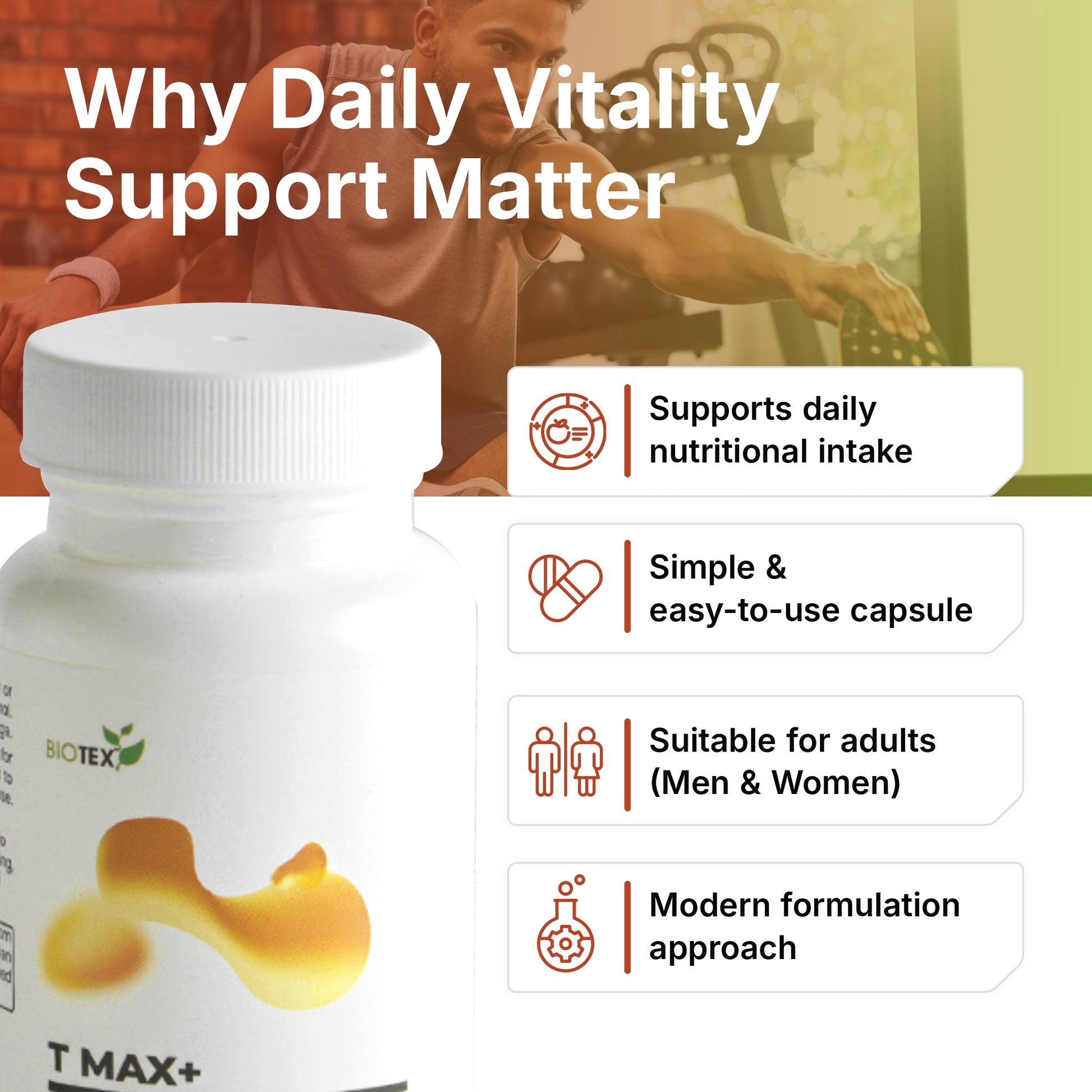 T MAX+ by BioTex Life Solutions Pvt. Ltd. is a herbal-based nutraceutical supplement formulated to support overall vitality, stamina, and wellness. It combines powerful natural extracts like Ashwagandha, Ginseng, Shilajit (Shiitake), Bacopa, and Fenugreek with essential minerals like Magnesium and Zinc, aimed at improving energy, endurance, cognitive performance, and stress resistance.